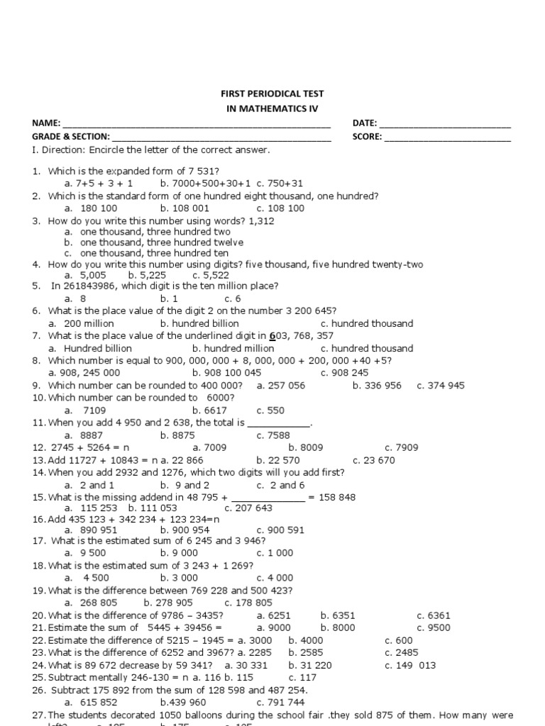 1st Periodical Test In Mathematics Vi