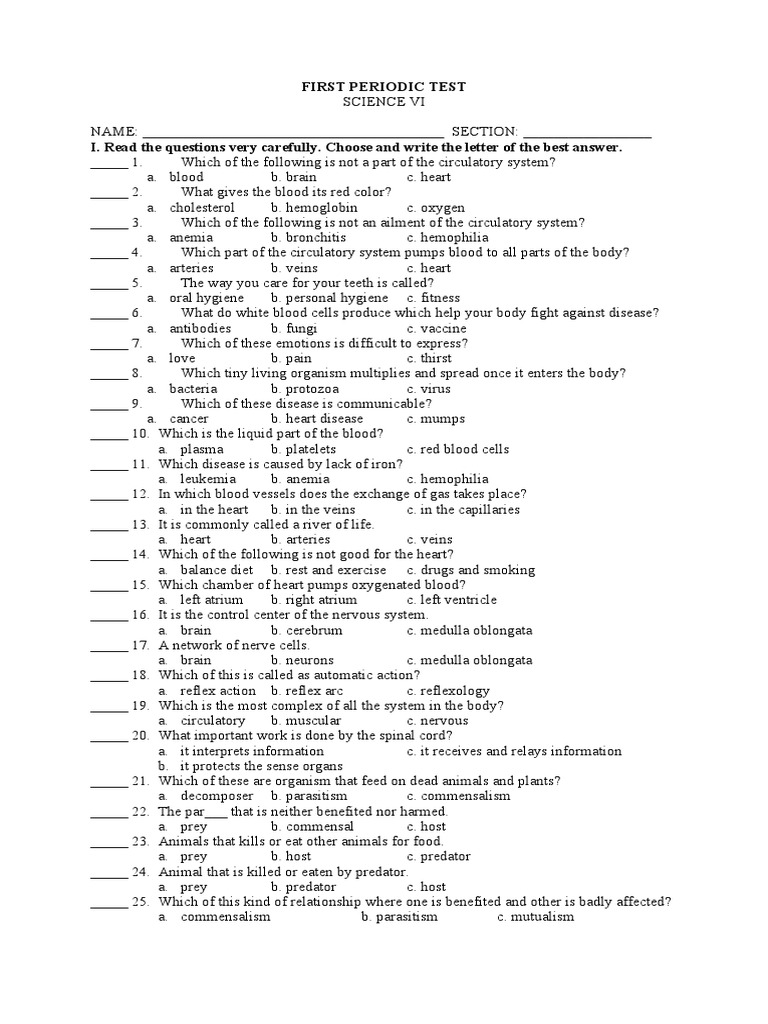 Firsr Periodical Test In Science Grade Vi Heart Circulatory