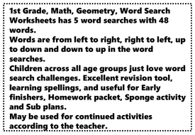 1st Grade Math Geometry Word Search Worksheets 48 Words
