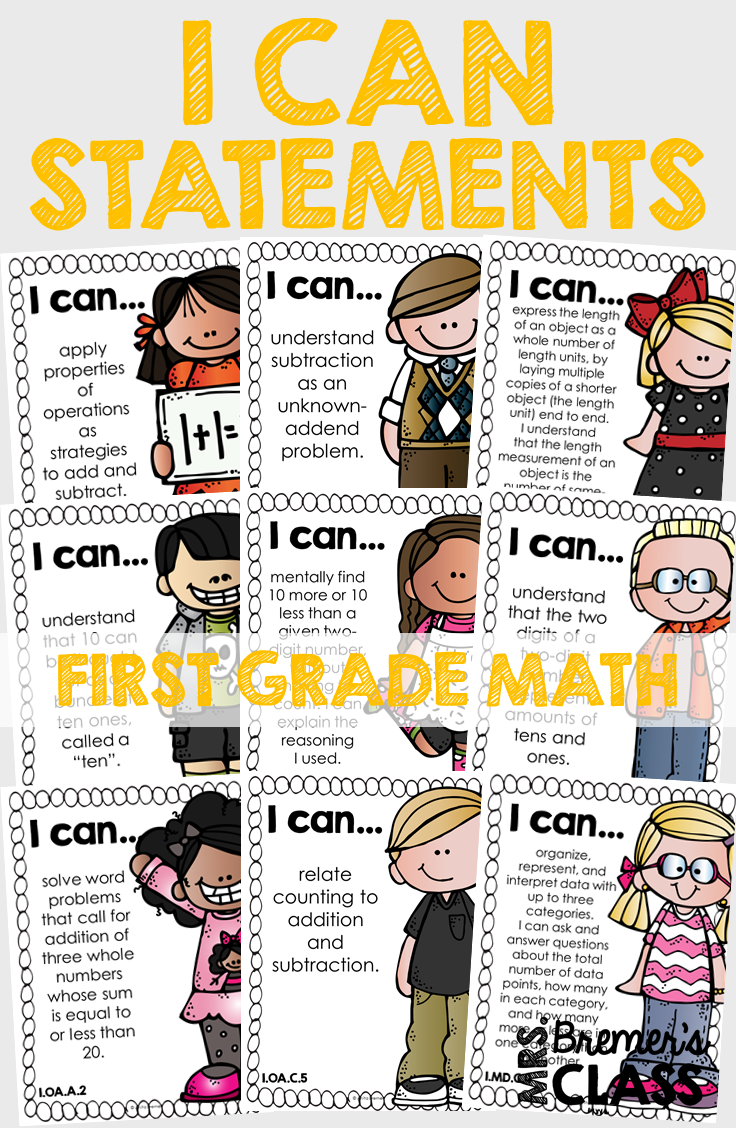 First grade math i can statements. 1st grade i can statements the following are grade level i can statements that you might want to use. Firstgrade strandreadingliterature topics standard icanstatements vocabularykeyideasanddetails rl11askandanswerquestionsaboutkey. These 1st grade i can common core statements are written to help you teach the standards in a language your students can more easily understand.