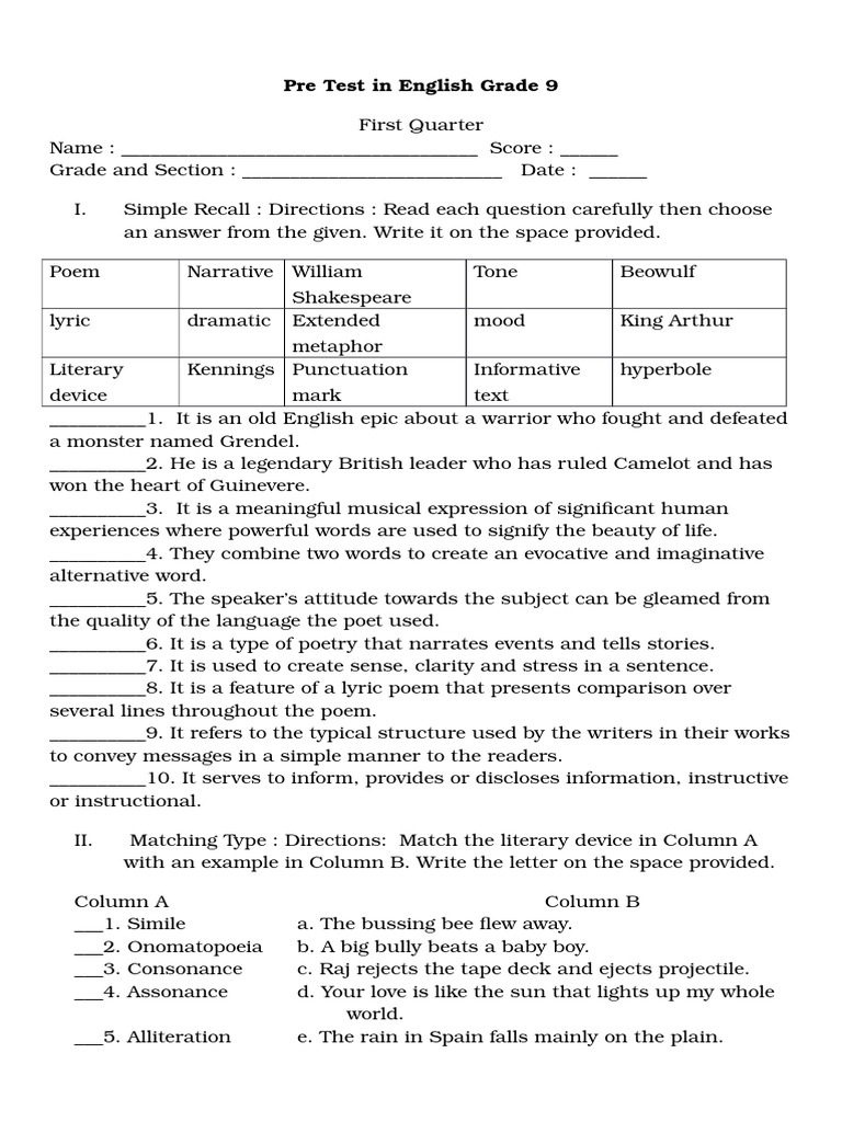 Pre Test In English Grade 9 First Quarter Beowulf Poetry