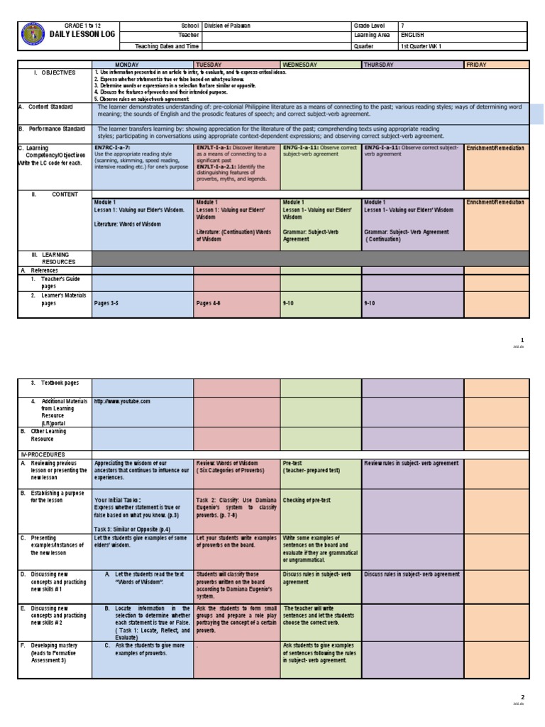 Daily Lesson Logs 1st Quarter Compilation Depedclick