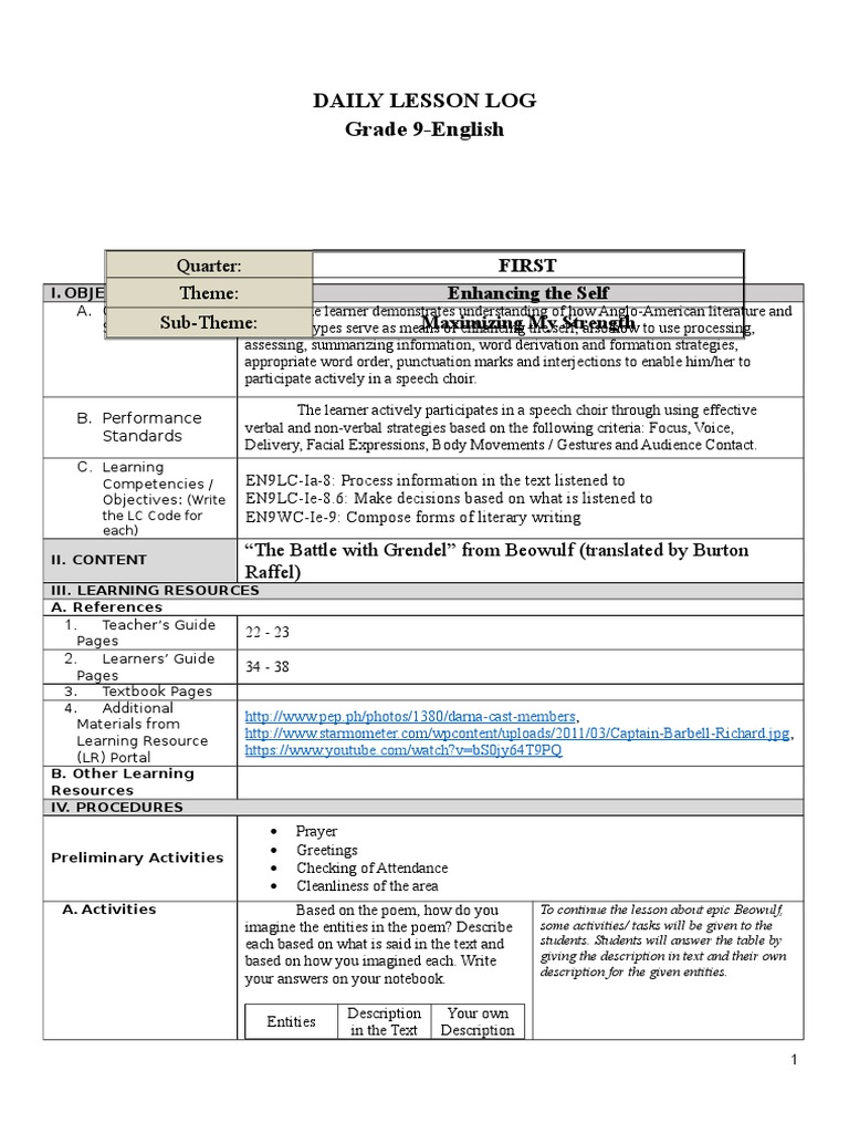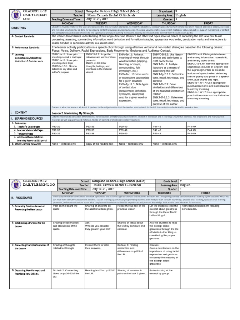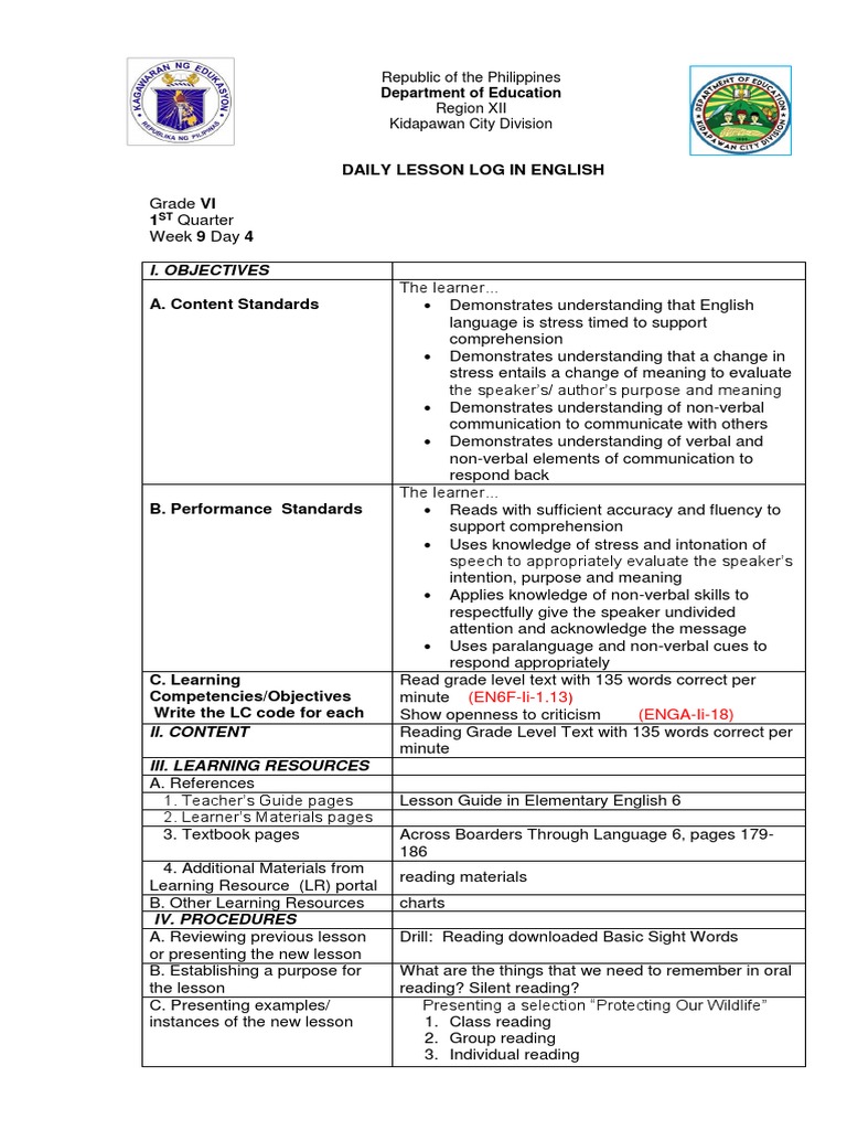 Daily Lesson Log Dll For Junior High School Grade 7 10 Deped