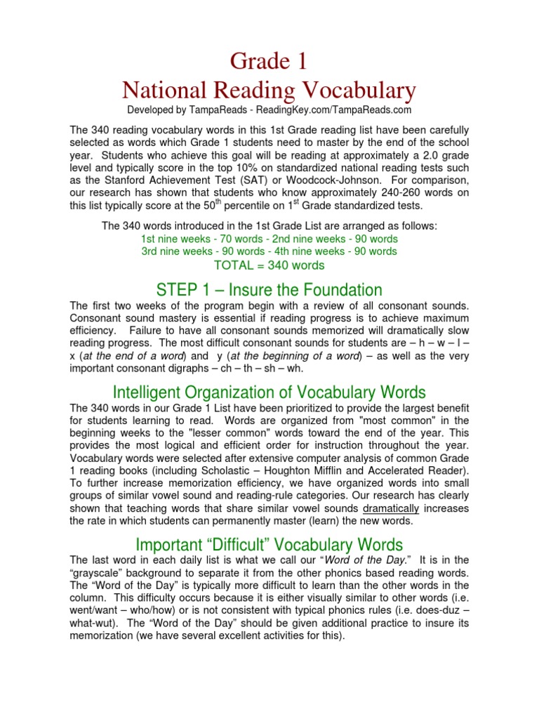 Grade 1 National Reading Vocabulary Developed By Tampareads